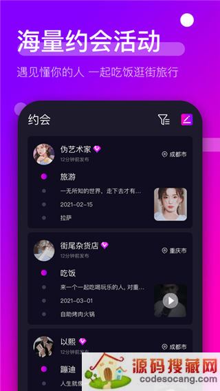 【主题邀约】可发布各种主题的约会邀请,如看电影、吃大餐、玩游戏、运动、旅游等。
