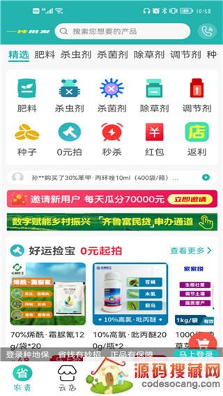 2、进入首页,为用户提供了超多农产用品,种类非常齐全,包含各种农药,肥料,杀虫剂,除草剂,工具等,用户需要的都可以在这里买到,有需要的用户还可以进行搜索。