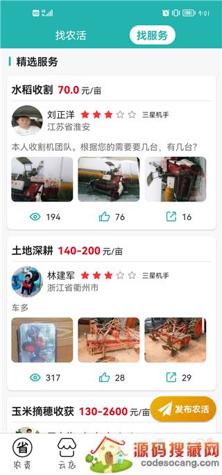 4、点击进入农活页面,这里有很多用户发布的各种农活信息,用户可以随意浏览查看,有感兴趣的可以直接和联系人进行练习,同时用户也可以发布农活服务。