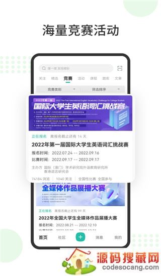 赛氪app是一款专注于服务大学生的高校社交服务软件,软件提供便利的同时提供免费报名工具和一站式服务,为各大高校的各个赛事领域垂直打造封闭的社区圈子,并形成保研、考研、留学、科研、创业等与学生前途和未来密切相关的话题小组。软件汇集了非常的丰富的活动,竞赛的范围也非常的广泛,包含的内容有:科学、工程、艺术、商业等等领域;在竞赛的深度运营基础上,我们增加了高校活动版块,提供高校线上、线下活动的发布、推广、报名、管理等完整的免费服务;软件还提供了问答模块,让更多的大学生可以了解竞赛的各种经验,有问题也可以直接咨询其他用户,有利于在竞赛前做好充足的准备,提升自己的竞技排名,有兴趣的小伙伴快来下载体验吧!