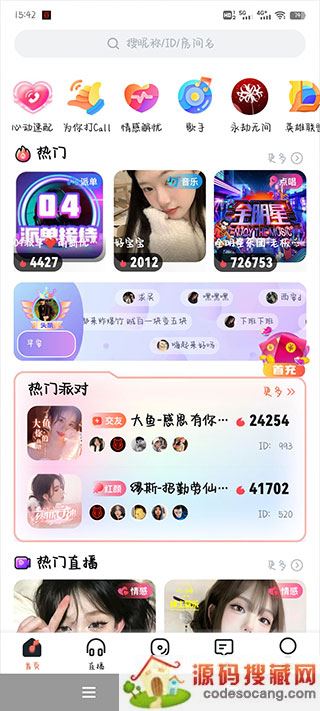 2、首页顶部可以快捷进入不同主题的语音聊天室、热门派对以及直播页面。