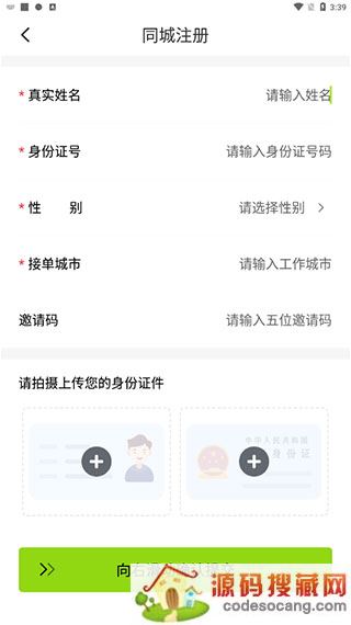 3、按要求填写姓名、证件号码、性别、接单城市,再拍摄上传身份证进行提交,审核通过即可进行接单。