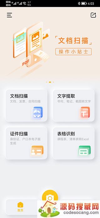 1、下载安装好后,打开软件,在首页里点击文件扫描,选择拍摄或者从相册选择想要扫描的文档或图片,点击拍摄,进入下一步。