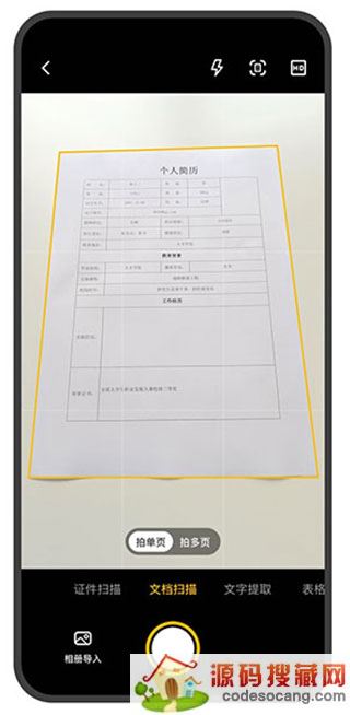 2、打开相机后,可以选择证件扫描、文档扫描、文字提取、表格识别,同时支持拍单页和多页,还可以从相册里导入。