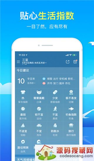 提供穿衣、洗车、紫外线、流感、运动、钓鱼、过敏、旅游等生活指数,还有精彩阅读等一系列趣味功能;