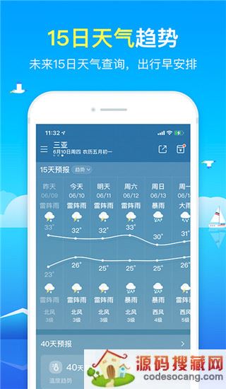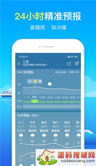 提供实况天气预报、24小时预报、未来15天天气预报、未来40日天气预报、污染指数、温度趋势、pm2.5、风力、湿度、日出日落、气压、能见度、空气质量指数等实用天气信息;