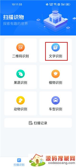 1、打开软件,可以看到功能有二维码识别、文字识别、果蔬识别、植物识别、动物识别、车型识别,选择要识别的功能,比如这里我们以选择文字识别为例
