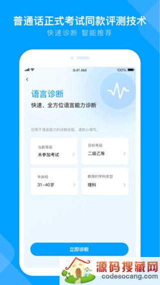 参照《国家普通话水平测试大纲》,题型覆盖单音节字词、多音节词语、朗读短文和命题说话。诊断结束后,系统会生成水平测试报告,用户通过查看报告了解自身的普通话水平等级及存在语音问题。