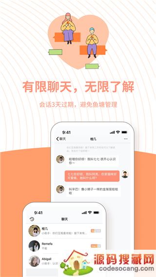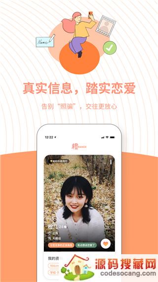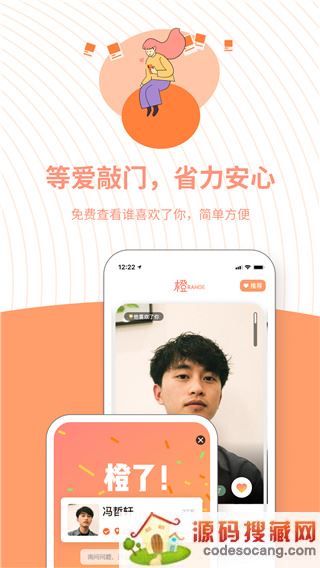 橙社交软件每天为你推荐合拍对象,男生表达好感,女生接收信号;开启三日聊天,过滤低效对话,找到聊得来的TA;资料真实,态度真诚,交换微信或约定见面,让网恋可以奔现