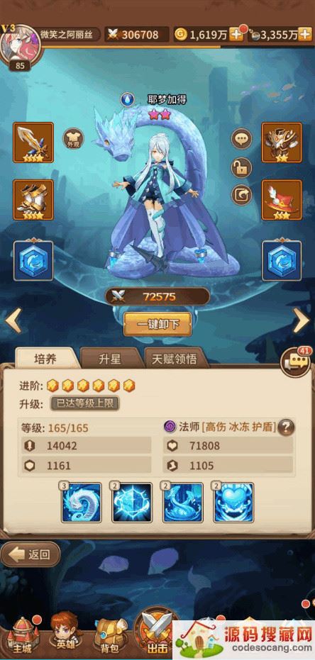 4、被动技能:深海守护(满级3级,提高自身30%攻击,15%生命,10%速度)苍蓝之心(满级3级,生命不低于30%,提高15%的暴击率,低于30%增加20%攻击力。)