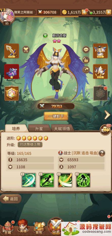 4、被动技能:风暴巨翼(提高自身30%攻击和15%的暴击率)凤王领域(斯芬克斯为我方先手时,伤害提高20%暴击率提高10%,否则有80%的几率额外攻击一个目标,伤害有原技能的80%),同样建议优先培养,人物搭配(前期清一色橙色武器装备,后期3到5星红色武器装备,彩色符文)阵容建议放在前方输出抗伤害。