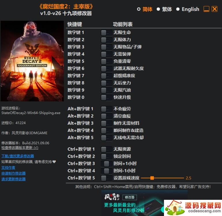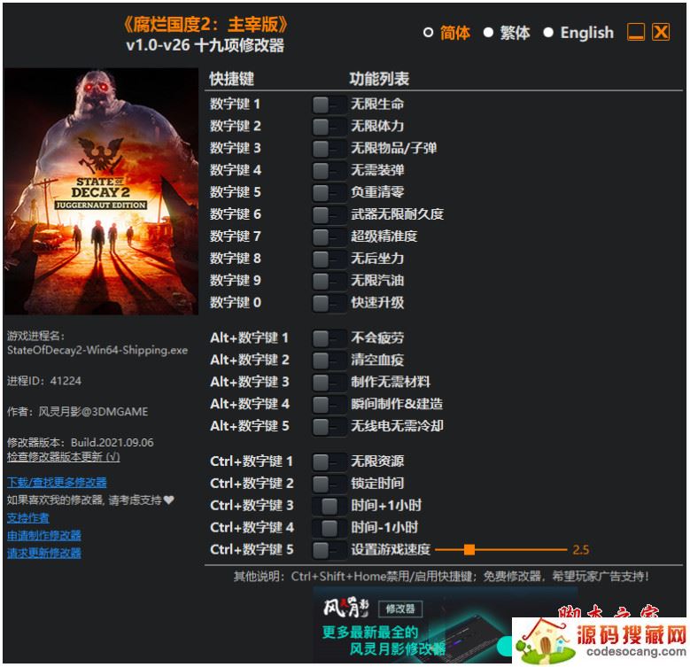 腐烂国度2主宰版十九项修改器是由风灵月影原创制作的一款游戏数据修改工具,自由修改游戏进行速度以及人物生命值、体力值等,感兴趣的玩家快来下载体验吧。
